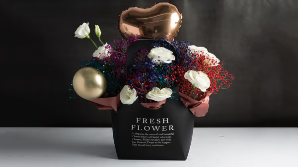 מארז מתנה בצורת תיק עם גיבסנית צבעונית ופרחי ליזיאנטוס.